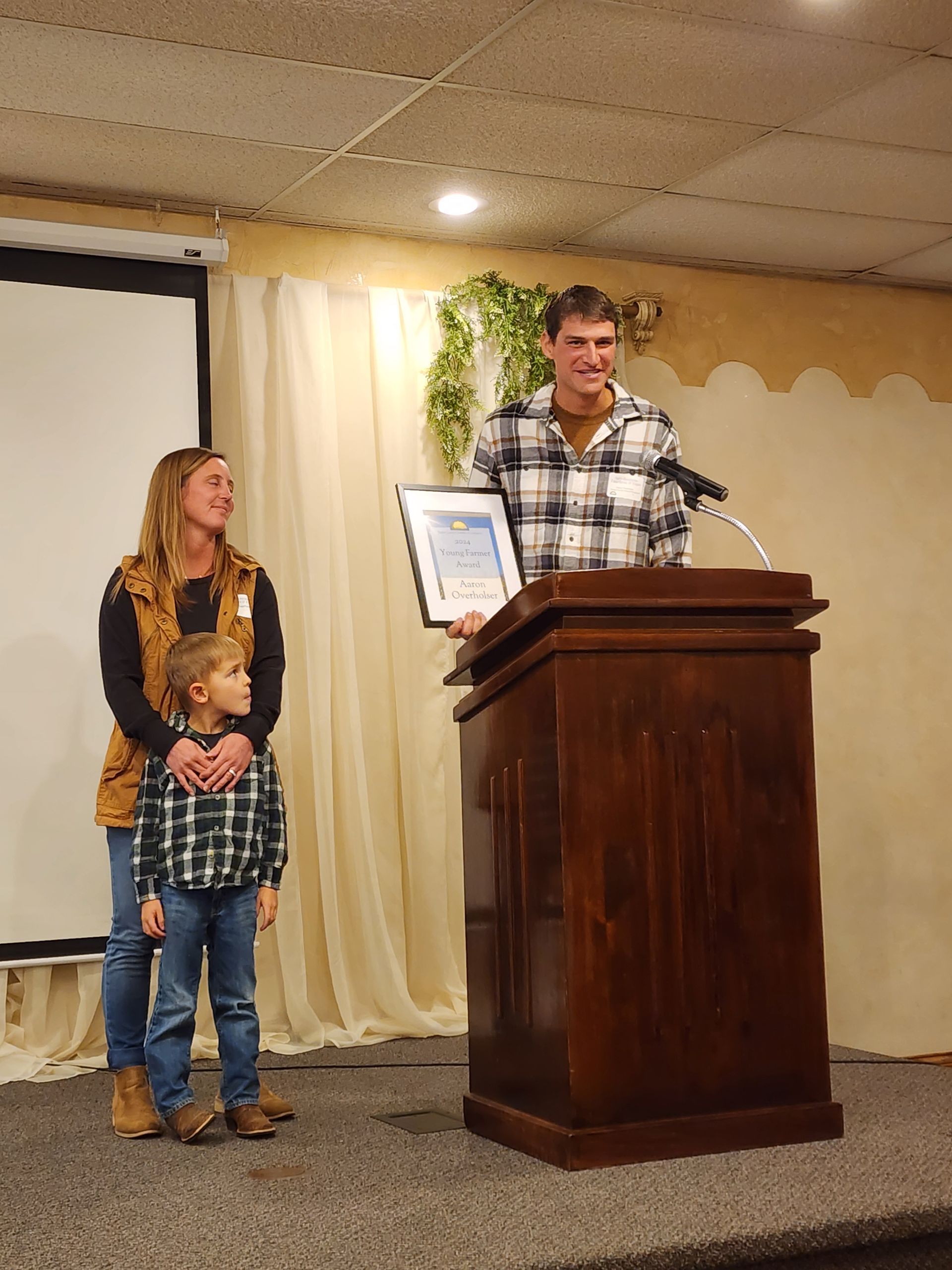 3. **Young Farmer Award**: Our Young Farmer Award Recipient is Aaron Overholser. Aaron is a forward-thinking farmer, not only focused on his current farming business, but also how he will leave the land for future generations. Aaron understands the value of family, hard work, and focus and puts all of those values into not just his farm, but also his community.