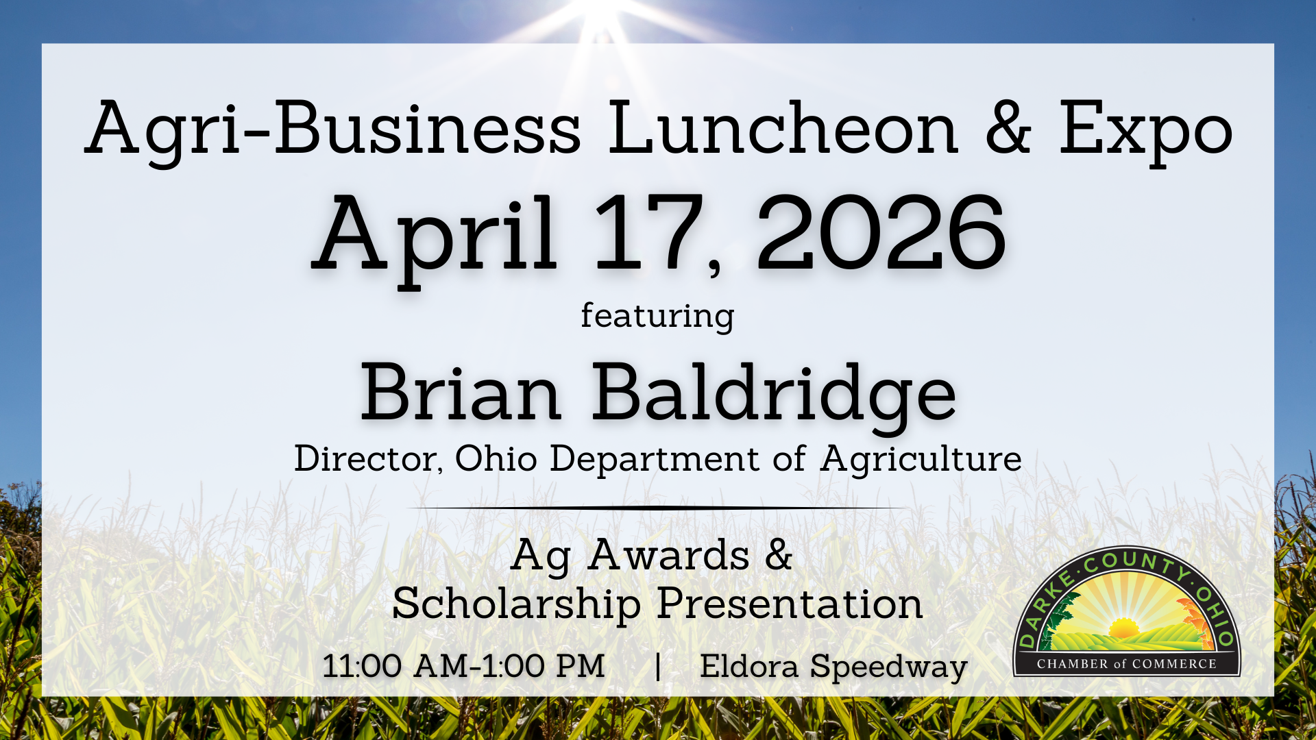 Thank you for registering for the Darke County Chamber of Commerce's Agri-Business Luncheon & Expo! We look forward to seeing you on April 17th at Eldora Speedway Ballroom!